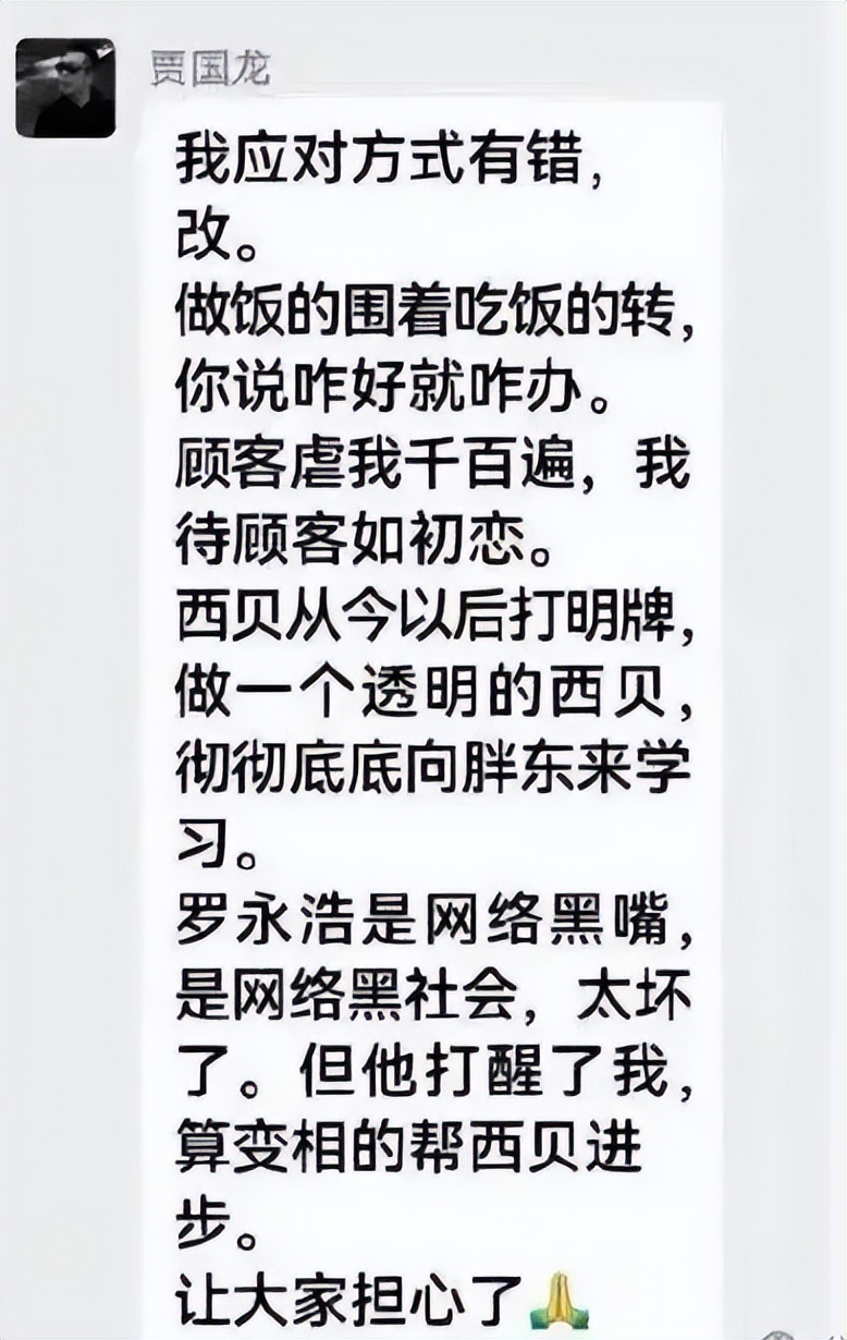 不算多夸言,跟着事务热度不竭攀升,西贝又衍生出客流下滑、卫生品控瑕疵等质疑,可谓一波未平一波又起。几乎一边倒的网友发声支撑下,9月13日深夜,罗永浩片面颁布发表“停和”,称西贝的工作能够告一段落了。9月14日下战书,西贝颁布发表封闭后厨参不雅通道。就正在各方预判两者将消声匿迹时,一段“不测”流出的截图再引和事。据红星本钱局,贾国龙正在报歉的同时,称罗永浩是收集黑嘴、收集。